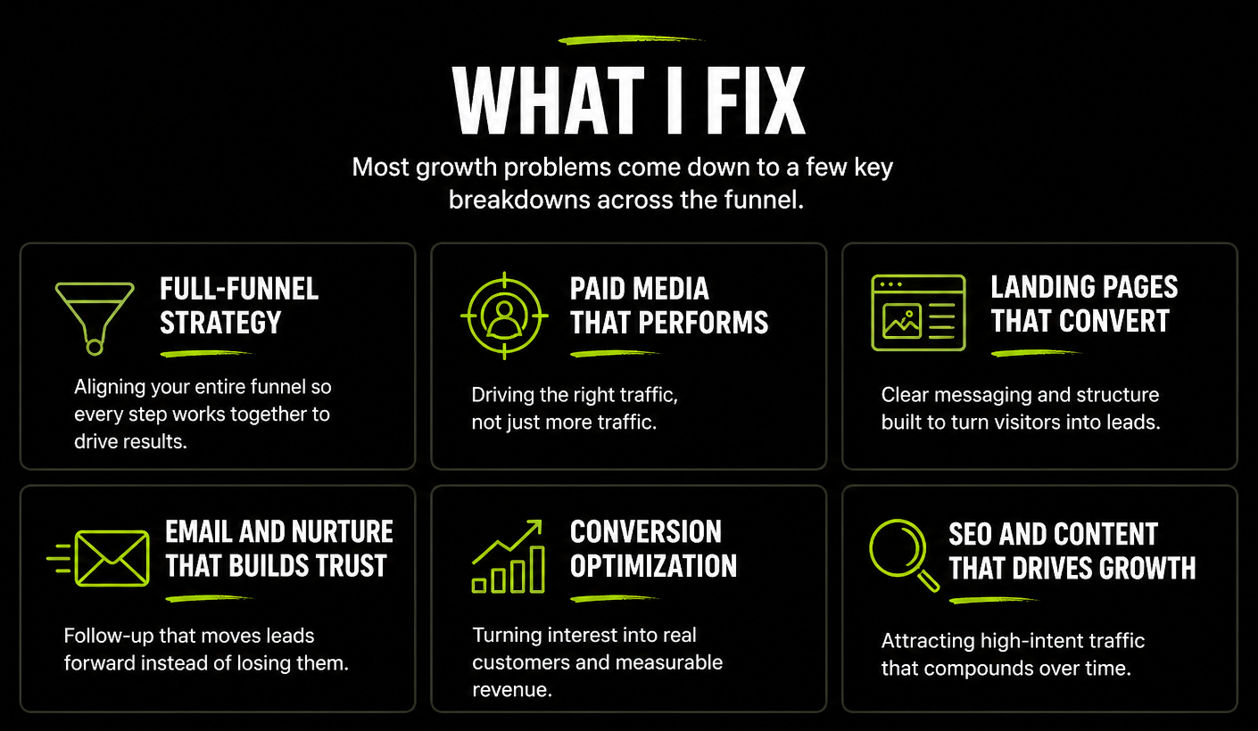 Most teams invest heavily in driving traffic, but the real opportunity is in what happens after the click. I focus on identifying where your funnel is breaking down and fixing the parts that are costing you growth. Not by adding more complexity, but by making the system work the way it should.